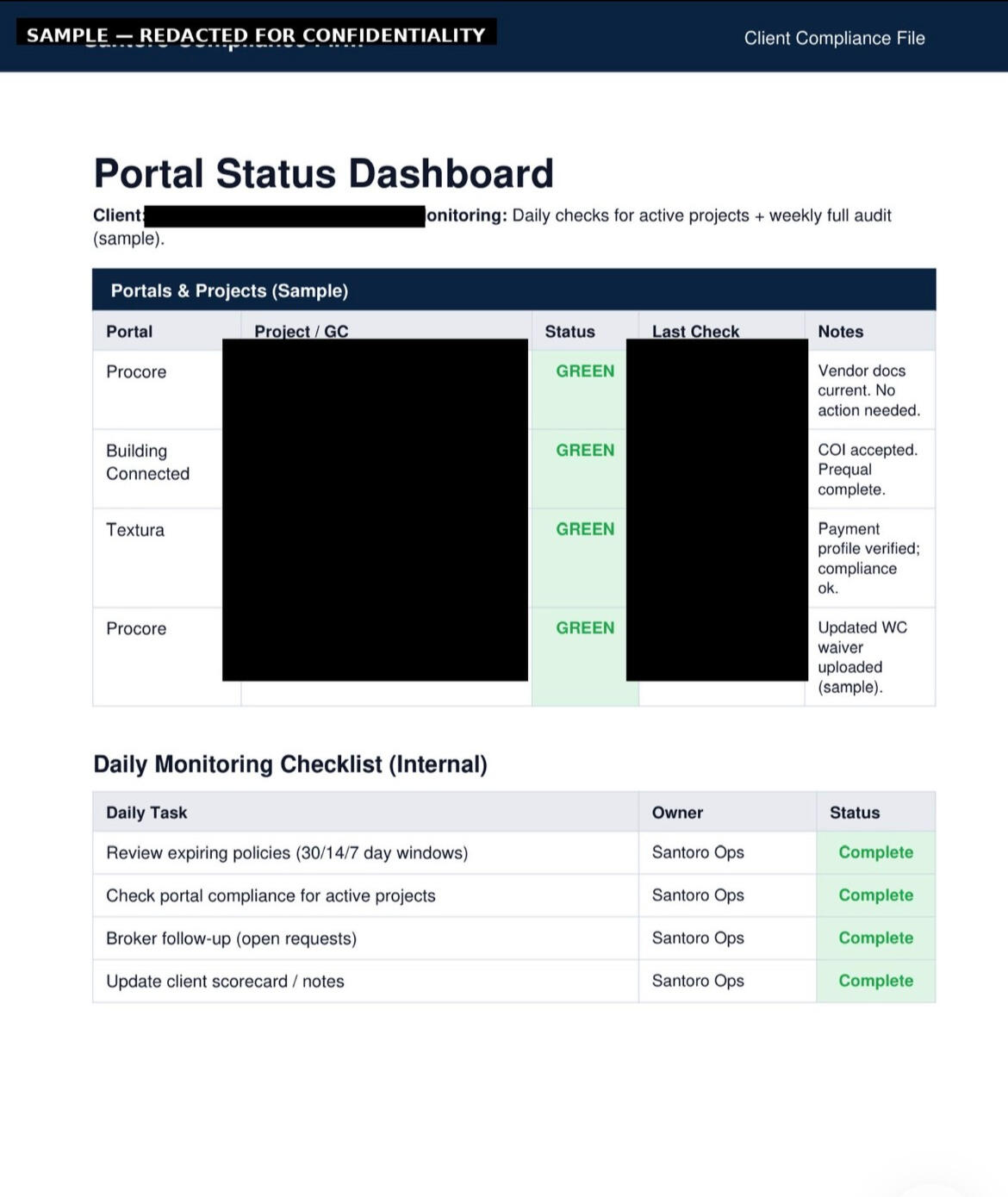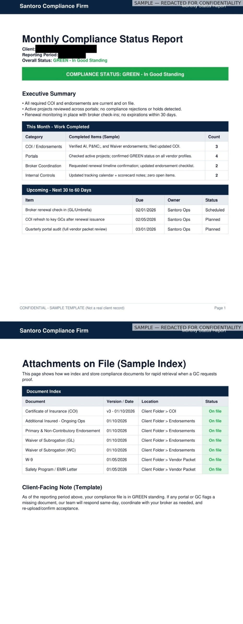 COIs, endorsements, expirations, vendor packets and portal uploads - handled month to month so you don't get blocked, delayed, or rejected.- Weekly updates + monthly compliance report